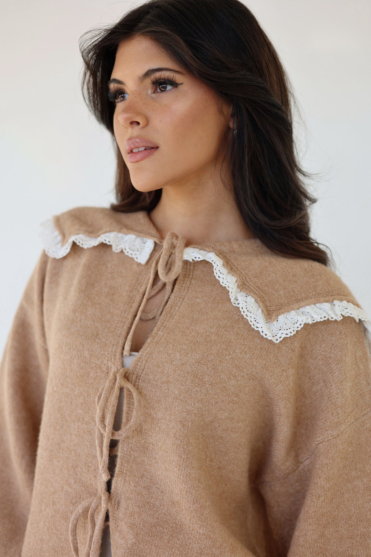 The Eliza Lace Collar Cardigan features a delicate lace-trimmed collar, adjustable front bow ties, and an oversized silhouette that feels cozy yet elevated. Finished in a warm neutral tone, this piece layers beautifully over tanks, tees, or dresses for an effortless, romantic look.