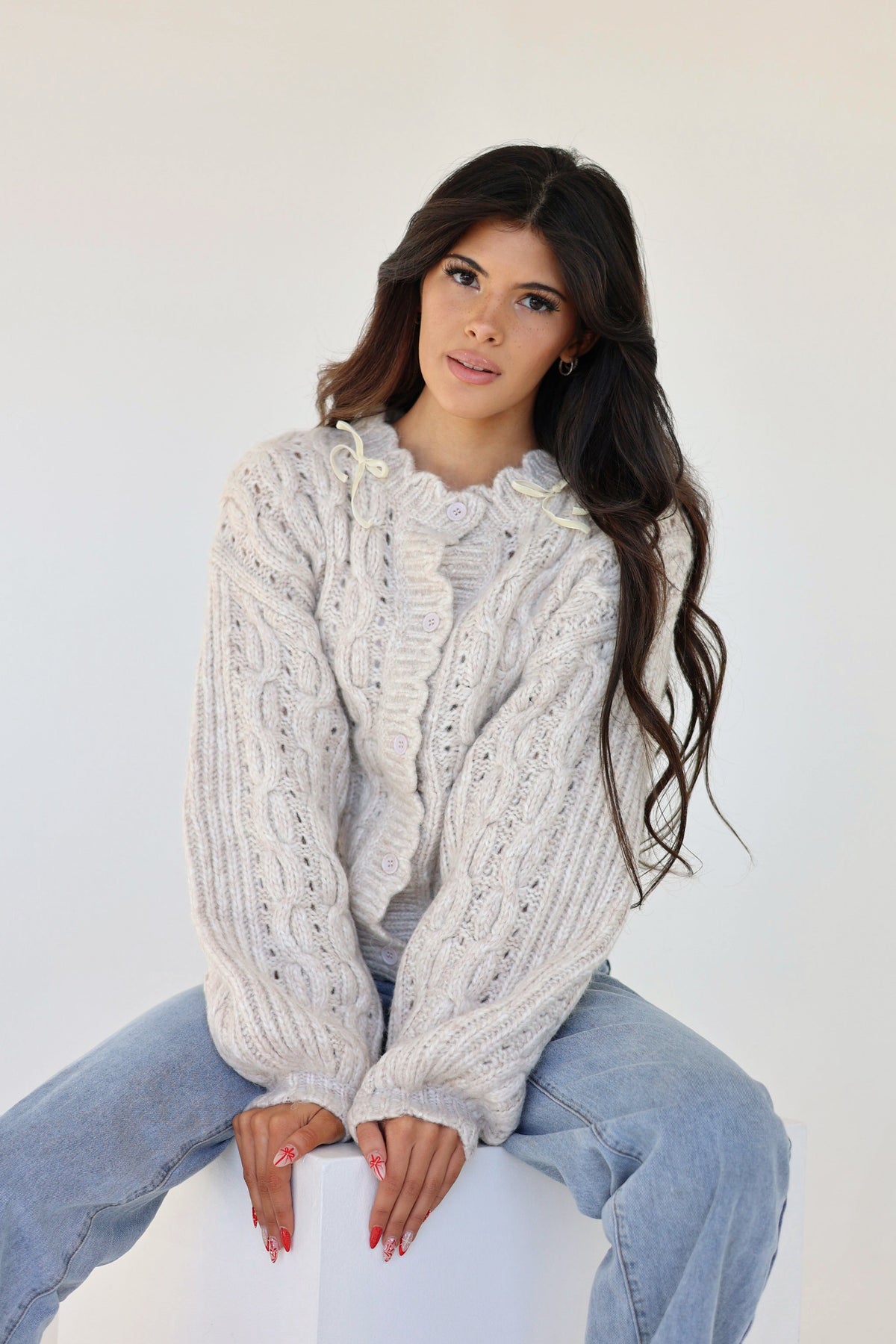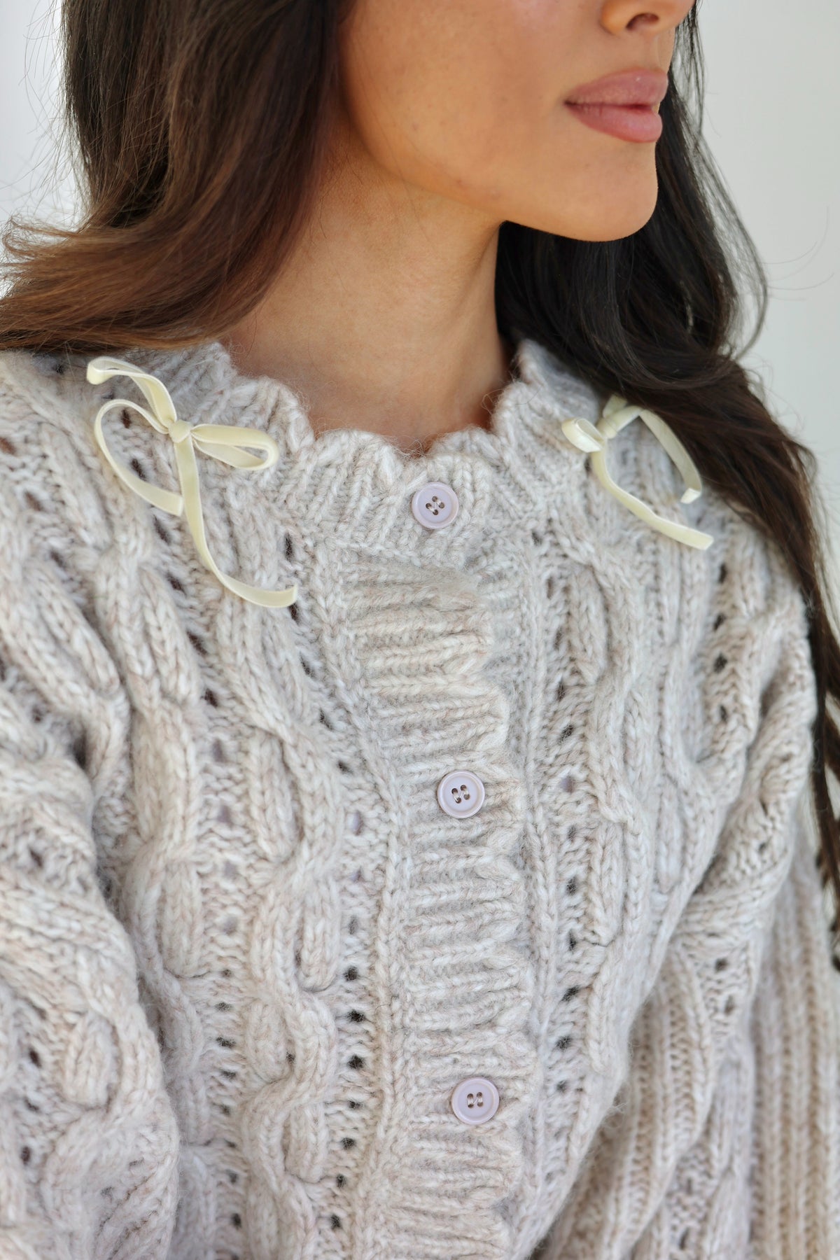 The Emilia Button Knit Cardigan adds soft texture and gentle structure to your wardrobe. Designed with a cable-inspired pattern, delicate scalloped trim, and flattering balloon sleeves, it’s an easy layer that elevates everyday outfits with a warm, effortless feel.