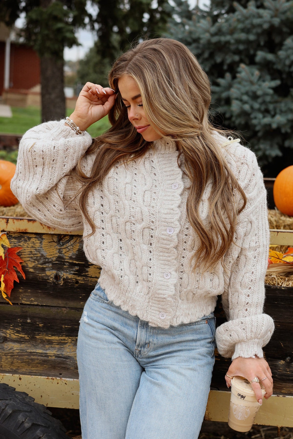 The Emilia Button Knit Cardigan adds soft texture and gentle structure to your wardrobe. Designed with a cable-inspired pattern, delicate scalloped trim, and flattering balloon sleeves, it’s an easy layer that elevates everyday outfits with a warm, effortless feel.